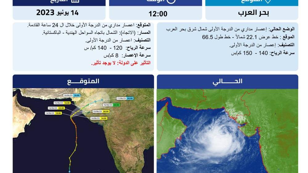 وذكر المركز في بيان له اليوم حول مستجدات الحالة المدارية أن الوضع الحالي لـ «بيبرجوي» يظل كإعصار من الدرجة الأولى ويتمركز شمال شرق بحر العرب، عند خط عرض 22.8 شمالا وخط طول 67.5 شرقا، وتبلغ سرعة الرياح حول المركز من 120 إلى 130 كم/الساعة، مع وجود تشكيلات من السحب الركامية الممطرة حول الإعصار.