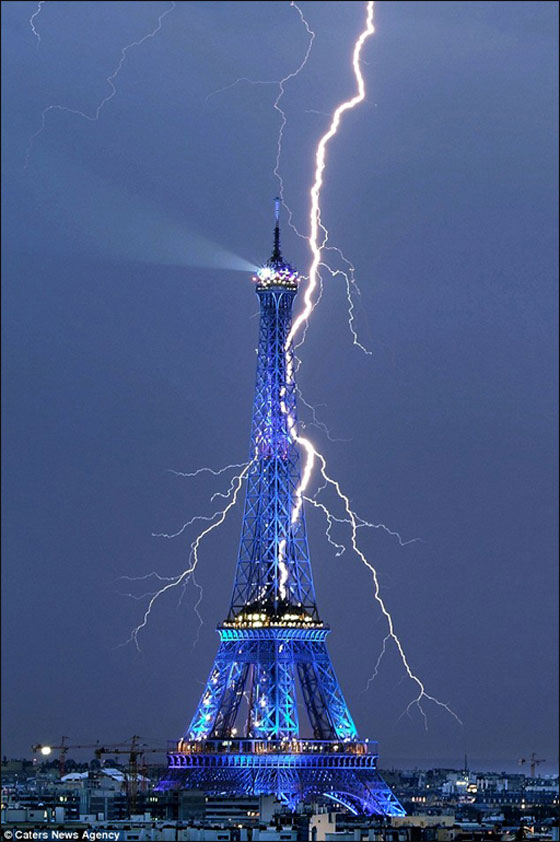 وقالت صحيفة " ديلي ميل" البريطانية ، إن برج إيفل، يمنح بإضاءته الزرقاء، بعدا دراميا في سماء باريس، لكن الطبيعة أرادات أن تزيد من هذه الدراما، حين نزل البرق كشوكة تضرب البرج وتشتعل فيه.