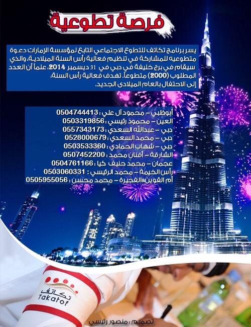 يسر برنامج تكاتف للتطوع الاجتماعي التابع لمؤسسة الإمارات دعوة متطوعيه للمشاركة في تنظيم فعالية رأس السنة الميلادية، والذي سيقام في برج خليفة في دبي في 31 ديسمبر 2014، من الساعة (10:00 مساءً، ولغاية 1:00 فجراً علماً أن العدد المطلوب (2000) متطوعاً. تهدف فعالية رأس السنة، التي تنظمها شركة إعمار العقارية، إلى الاحتفال بالعام الميلادى الجديد.