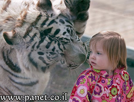 لم يتمكن هذا النمر من التهام الطفلة لأن هناك حاجز زجاجي سميك جداً يفصل بين الاثنين ..