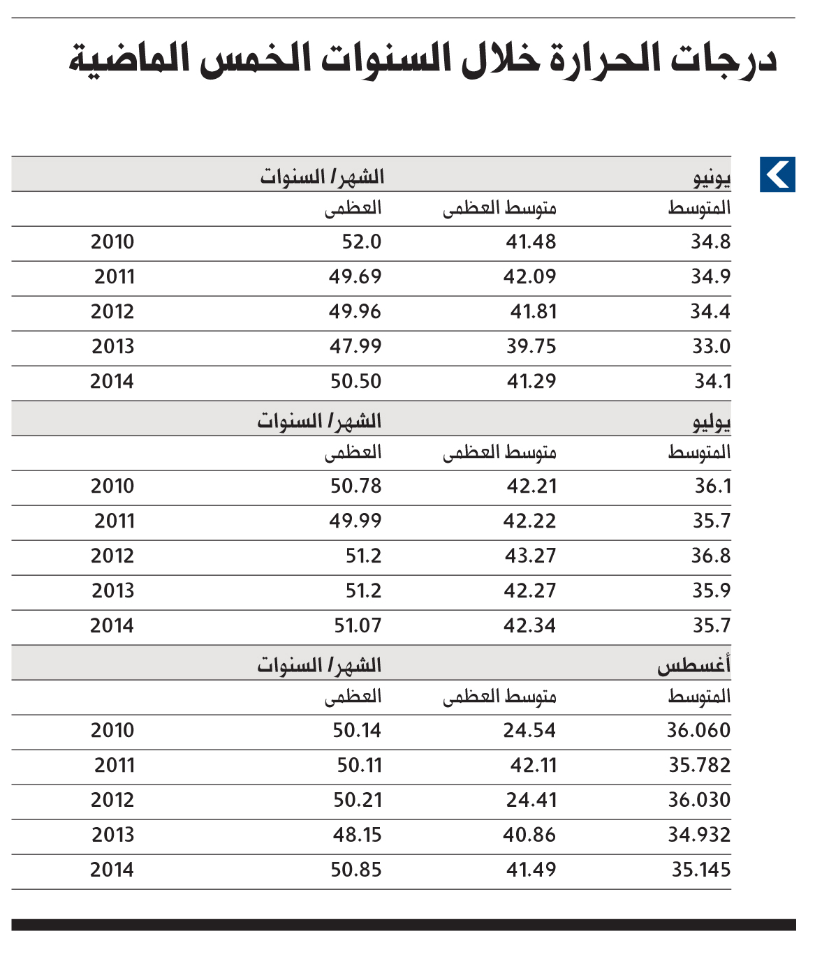 * المناطق الساحلية: العظمى من 36 إلى 44 درجة مئوية، والصغرى من 29 إلى 31 درجة مئوية.
