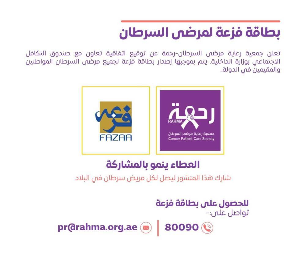 ويمكن لجميع مرضى السرطان من المواطنين والمقيمين بالدولة، الحصول على بطاقة (فزعة) من خلال التواصل مع جمعية «رحمة» عبر الرقم التالي: 80090 أو عبر البريد الإلكتروني: pr@rahma.org.ae.